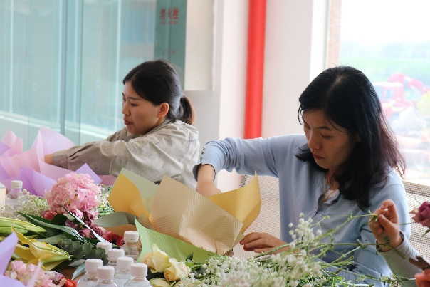 在由玫瑰花、洋桔梗、繡球花、百合、滿天星之香氣調和而成的陣陣馨香中,花藝師向女職工們講解插花知識,介紹花材的名稱、養(yǎng)護方案、花材的處理和修剪方法,示范插花步驟,女職工們聚精會神地學習后認真設計自己的花籃,相互討論,時不時迸發(fā)出爽朗的笑聲,經過精心設計,一個個形態(tài)飽滿、充滿生命力的花籃就誕生了,大家紛紛拿出手機,記錄下這美好的時刻。
